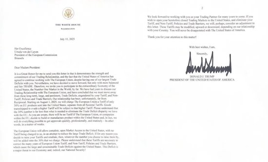 △特朗普致欧盟委员会主席冯德莱恩的信件