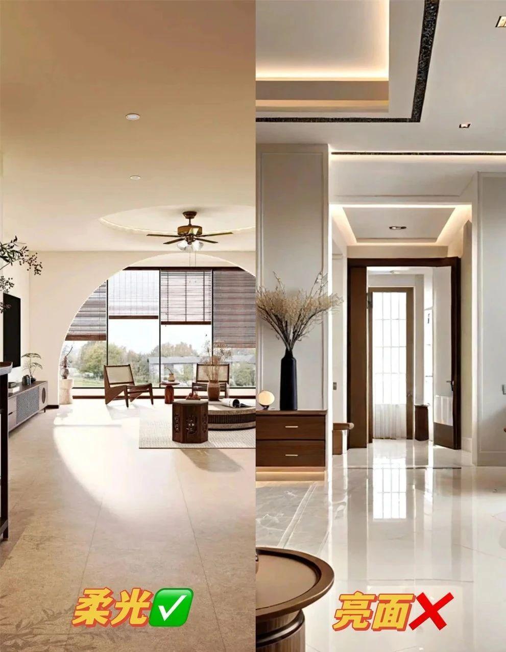 2)地砖优选柔光砖,或石砖木地板
