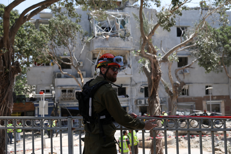 6月22日,应急人员在以色列海法一处被导弹损毁的建筑旁工作。以色列国防军22日说,伊朗对以色列发动新一轮导弹袭击。以色列急救组织“红色大卫盾”说,至少16人在本轮袭击中受伤。特拉维夫、海法均收到被导弹击中的报告。\n 新华社/路透