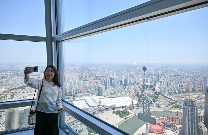 6月22日,游客在“天津之心”津塔观光厅与城市风光合影。\n6月22日,位于天津环球金融中心79层的“天津之心”津塔观光厅正式对外开放,市民游客可在310米的高度,360度全景欣赏天津的城市魅力。位于天津中心城区海河畔的天津环球金融中心(即津塔写字楼)总高度336.9米,2011年投入使用,是天津地标性的超高层建筑之一。\n 新华社记者 孙凡越 摄