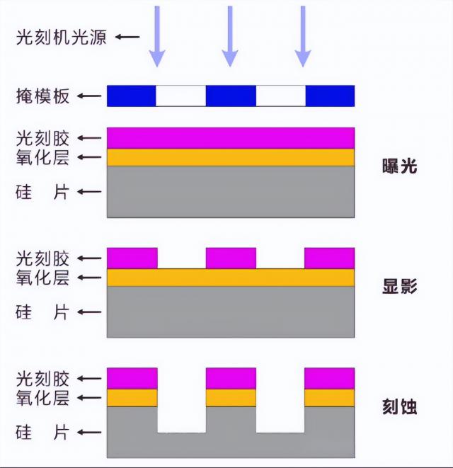 光刻环节将电路图形转移到覆盖于硅片表面的光刻胶上,通过光照和显影实现。