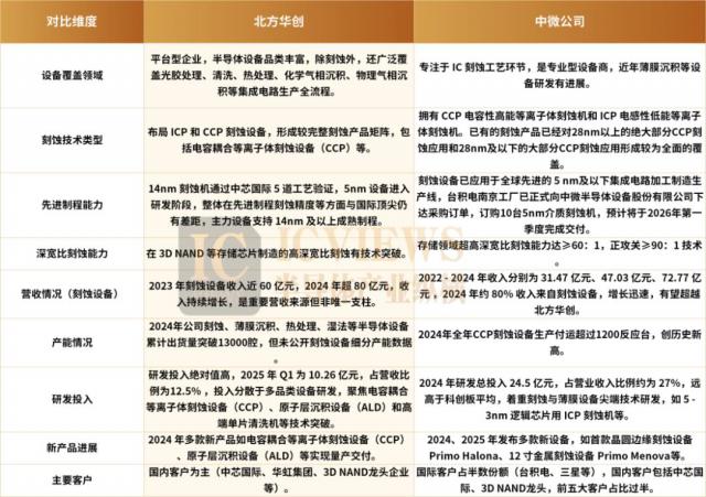 在具体的刻蚀设备上,这两家公司也各有侧重。北方华创主营硅刻蚀设备,中微半导体专攻介质刻蚀设备。