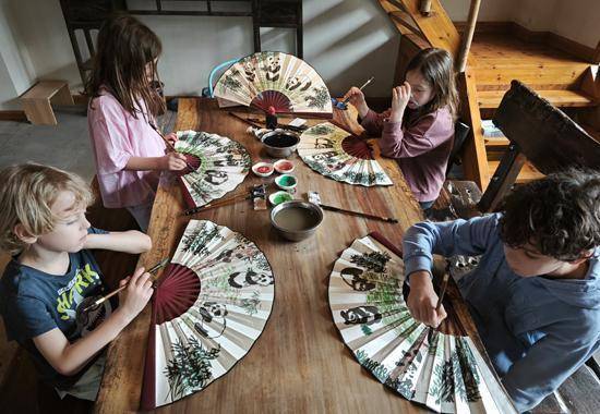 国际研学团学生体验扇画。阳朔县委宣传部供图