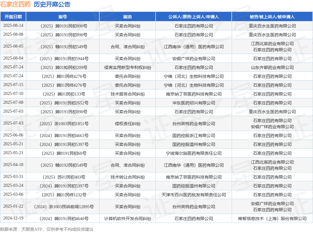 案号:(2025)赣0192民初549号审理法院:南昌经济技术开发区人民法院案由:合同、准合同纠纷当事人信息: 原告/上诉人:江西南华(通用)医药有限公司 被告/被上诉人:江西北宸药业有限公司、石家庄四药有限公司开庭日期:2025年8月5日根据统计,近一年内以石家庄四药有限公司为当事人的历史开庭公告有22则,其中案由为“买卖合同纠纷”的公告以11则居首,其次为“技术服务合同纠纷”有3则,“合同、准合同纠纷”有2则。历史开庭公告(前20条)如下:
