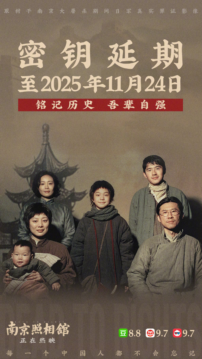 不过院线爆款往往会延长密钥,比如春节档上映的《哪吒之魔童闹海》,从1月29日公映,到6月30日密钥到期,共放映了5个月。又比如这次要聊的《南京照相馆》,如果后面不再延期,那么到11月24日,电影在院线上映4个月,比《哪吒2》少一个月。