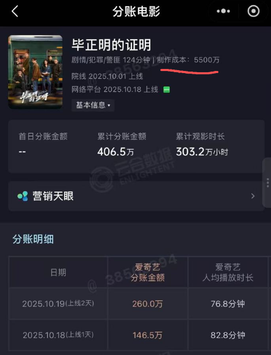 片方肯定是有压力的,有平台给出《毕正明的证明》制作成本5500万,目前片方分账才2500多万,还有差不多3000万的缺口。