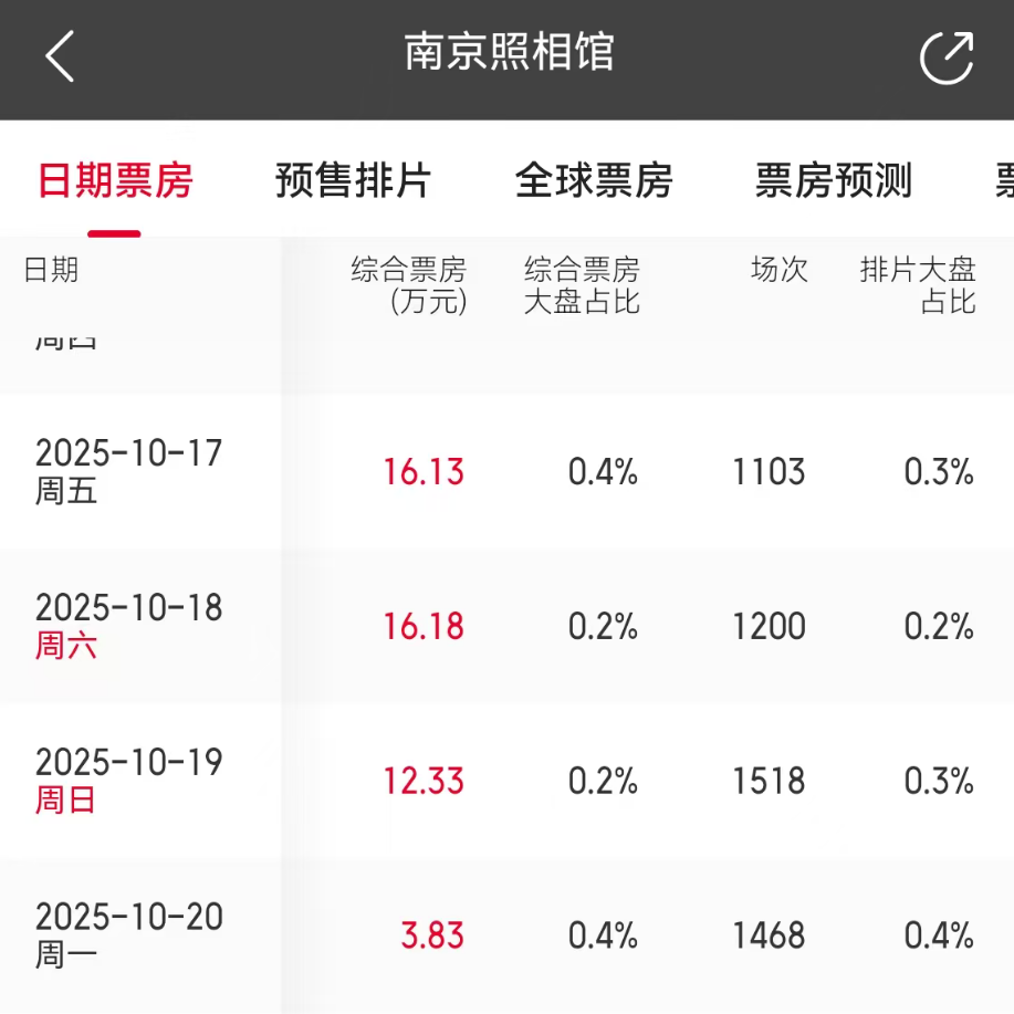 算了下10月1日国庆档开始至今《南京照相馆》的票房,由于国庆档新片不太给力,假期期间曾有过两天超过70万的小高潮,但之后又迅速下跌,估算了下,10月1日至今,累计票房500万左右。