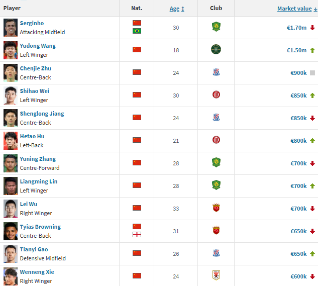他和归化球员塞尔吉尼奥也是唯一进入中超前12名的中国球员,其他球员的具体身价情况如下: